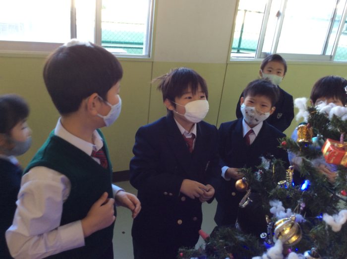 1年生が、学校の玄関にクリスマスツリーを飾ってくれました。