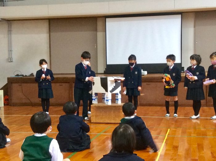 1年生は、冬休みの作品発表をしてくれました。漢字・羽子板・クモの巣の工作・扇子・スノードーム・風車・お習字・宝箱・鏡餅 …思い思いの素敵な作品を披露してくれました。