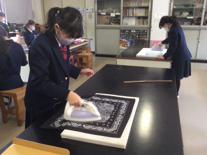 それぞれ好みの色のバンダナを選び、アイロンをかけました。