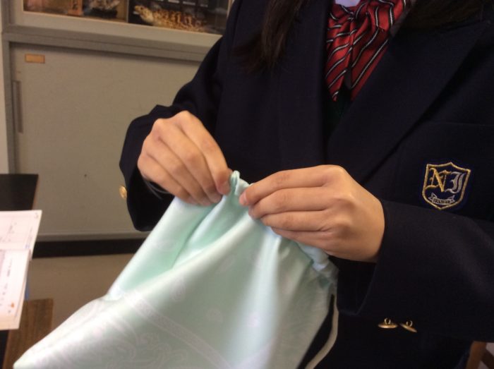 せっかくなら作品を作ってみようということで、バンダナを使った巾着に挑戦です。
