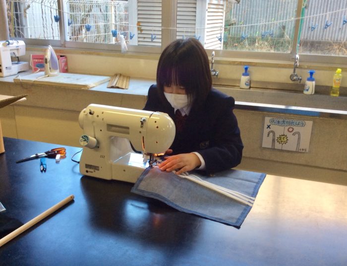 家庭科でミシンを使ったばかりの5年生は、慣れた手つきです。