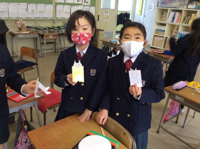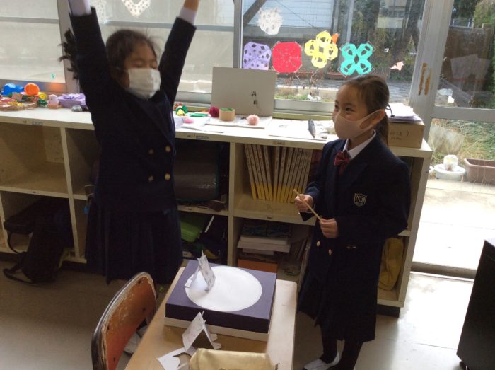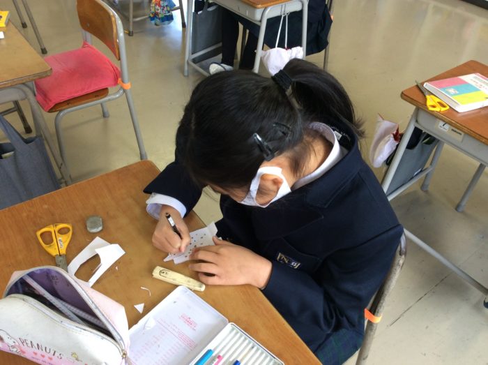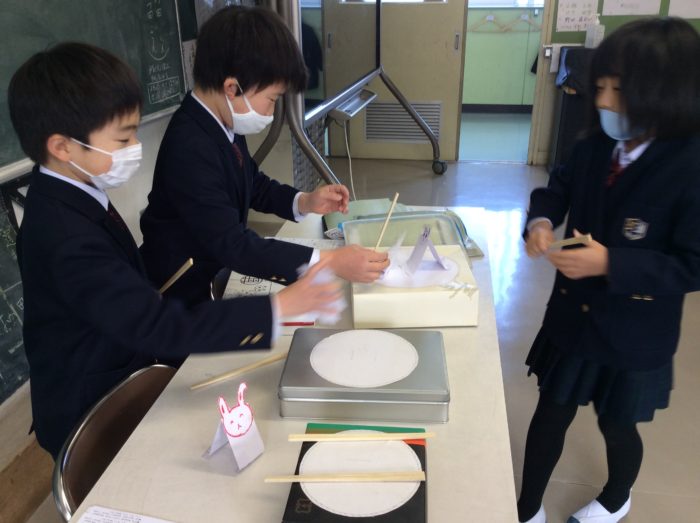 2021.02/08 育英っ子ブログ 2年生 紙ずもう大会 今日のアドバンスは、紙ずもう大会をしました。 「わたしは、かわいいのにしよう。」 「わたしは、うさぎ」 画用紙を半分に折って足を作り、好きな顔をかいてはりつけます。 オリジナルの力士が出来上がりました。 「はっけようい のこった!」 「トントン トントン」 割り箸で土俵をたたいて、相手を倒します。 「やったあー。わたしのかち!」 あちらこちらで、取り組みが始まりました。 「ああ、たのしかった。」 またしたいね。 次の記事へ 一覧に戻る 前の記事へ