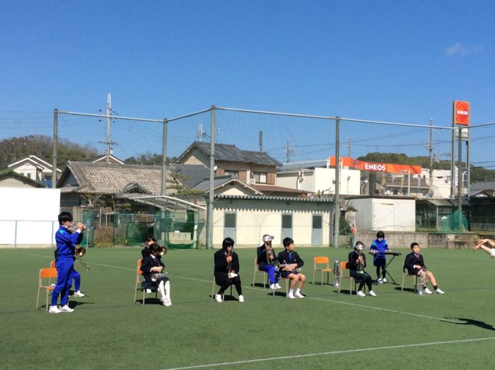 2021.03/03 育英っ子ブログ 金管バンドクラブ「コンサート」 今日はきれいな青空の下、奈良育英小学校金管バンドクラブのコンサートがありました。 「リパブリック賛歌(アメリカ民謡)」「裸の心(あいみょん)」「聖者の行進(アメリカ民謡)」の3曲を演奏してくれました。 このメンバーで演奏する最後のコンサート。金管バンドクラブのメンバーの気持ちが伝わってくるすばらしい演奏でした。 きれいな演奏にみんなうっとり。 3年生から入部できます。興味のある人は、ぜひ金管バンドクラブへ! 次の記事へ 一覧に戻る 前の記事へ
