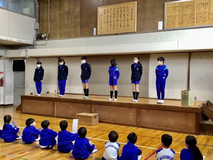 2021.04/19 育英っ子ブログ 全校集会 今年度初めての全校集会がありました。 密をさけるため、今回は低学年の部と高学年の部に分かれて行いました。 最初は新しく入学してくれた1年生の紹介です。 1人ずつ名前と好きなものを発表してくれました。大きな声で言えていてかっこよかったです。これからいっしょにたくさん遊ぼうね! 次になかよしグループのリーダーから挨拶がありました。 リーダー中心に、みんななかよし、笑顔あふれる奈良育英小学校にしていきたいですね。 次の記事へ 一覧に戻る 前の記事へ