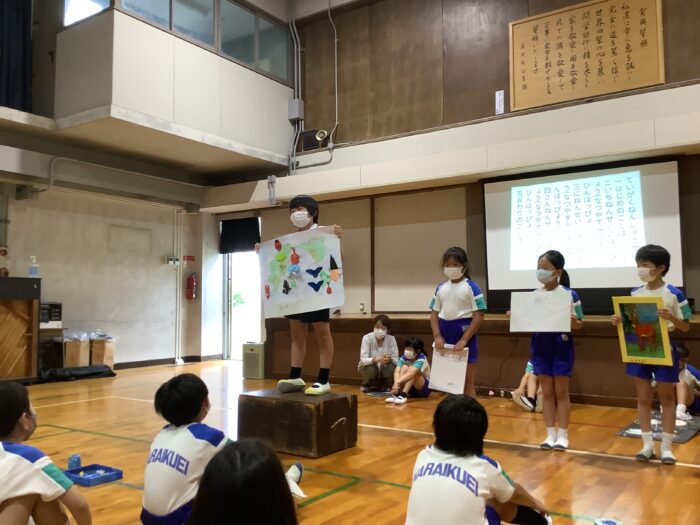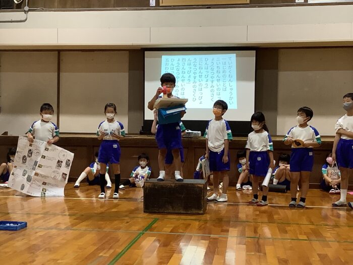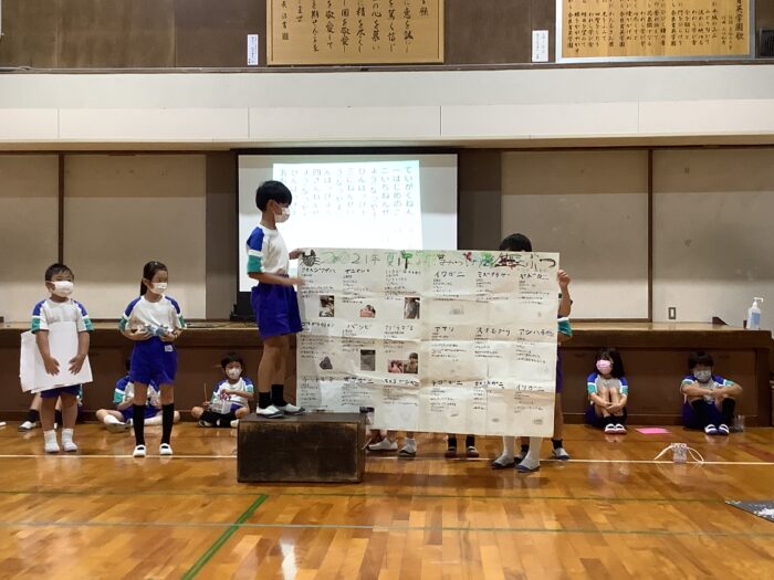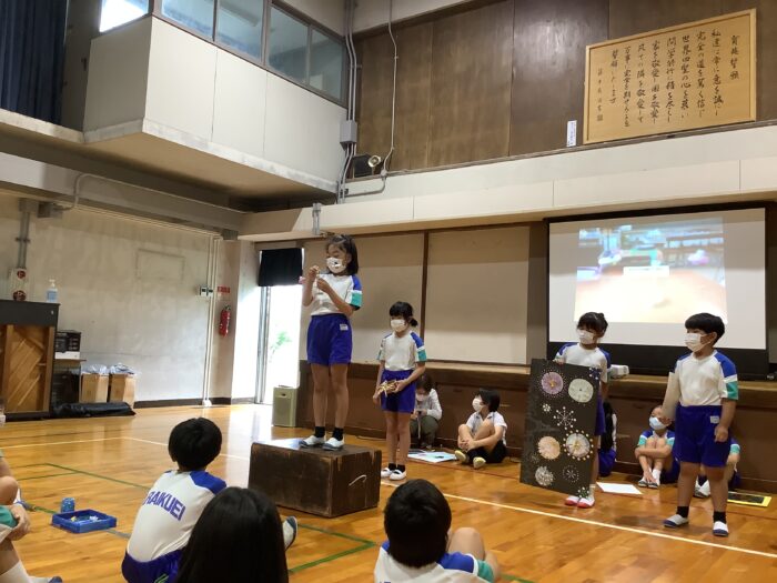 1年生は初めての夏休み。夏休みの作品づくりも初めてです。旅日記や生き物の観察など、上手にまとめたり、竹馬や紙すきなど素敵な作品が仕上がったり、みんなよくがんばりましたね。発表もとても上手でした!