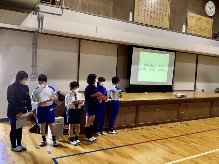 図書室に新しく入った辞書に載っていたクイズを紹介してくれました。楽しいクイズがたくさんありました。