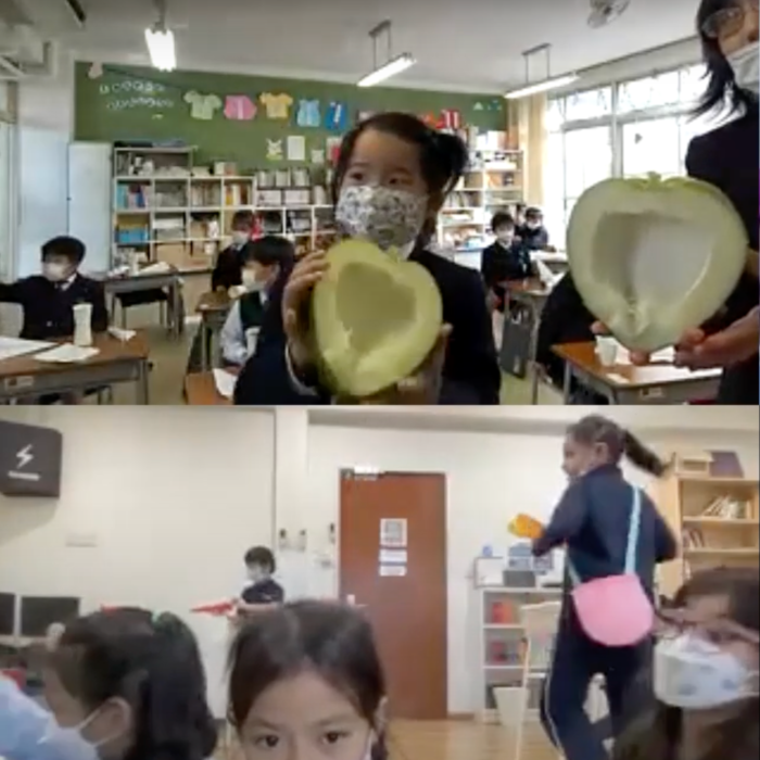 1年生は『松ぼっくりのけん玉』や『紙飛行機』をマレーシアのSriAriaという学校の子供達に紹介しました。
