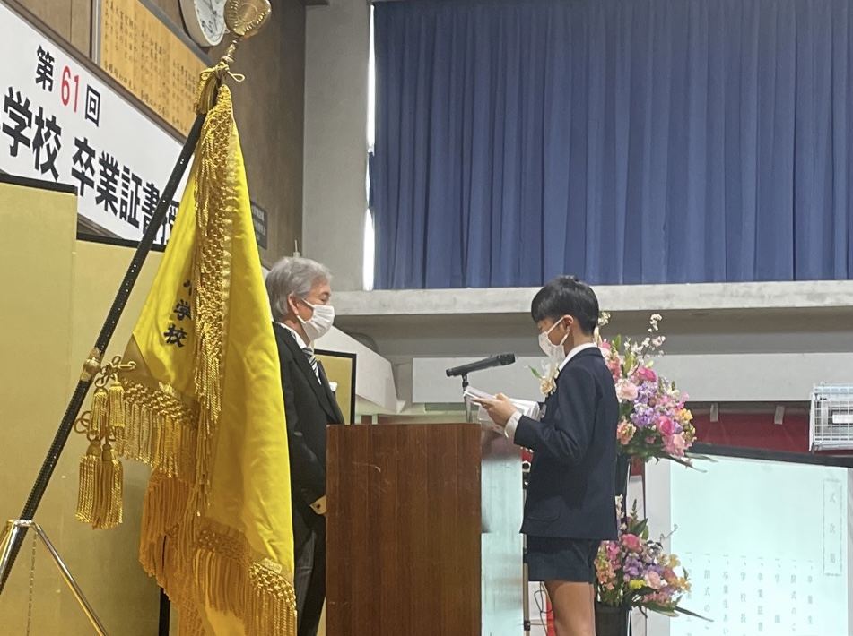校長先生から卒業証書を受けとりました。大きな声で返事をして、舞台にのぼる姿はとても凛々しく、かっこよかったです。