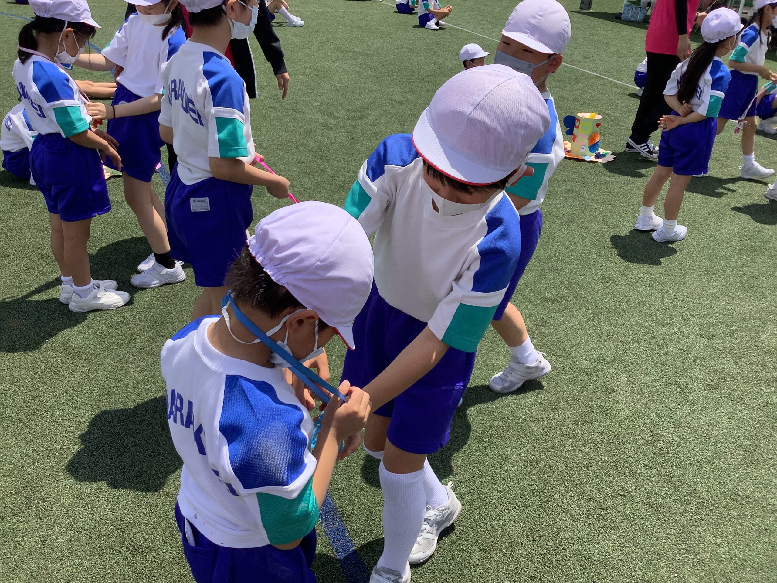 デカパンを上手く履けるように6年生が優しくフオローしてくれました。