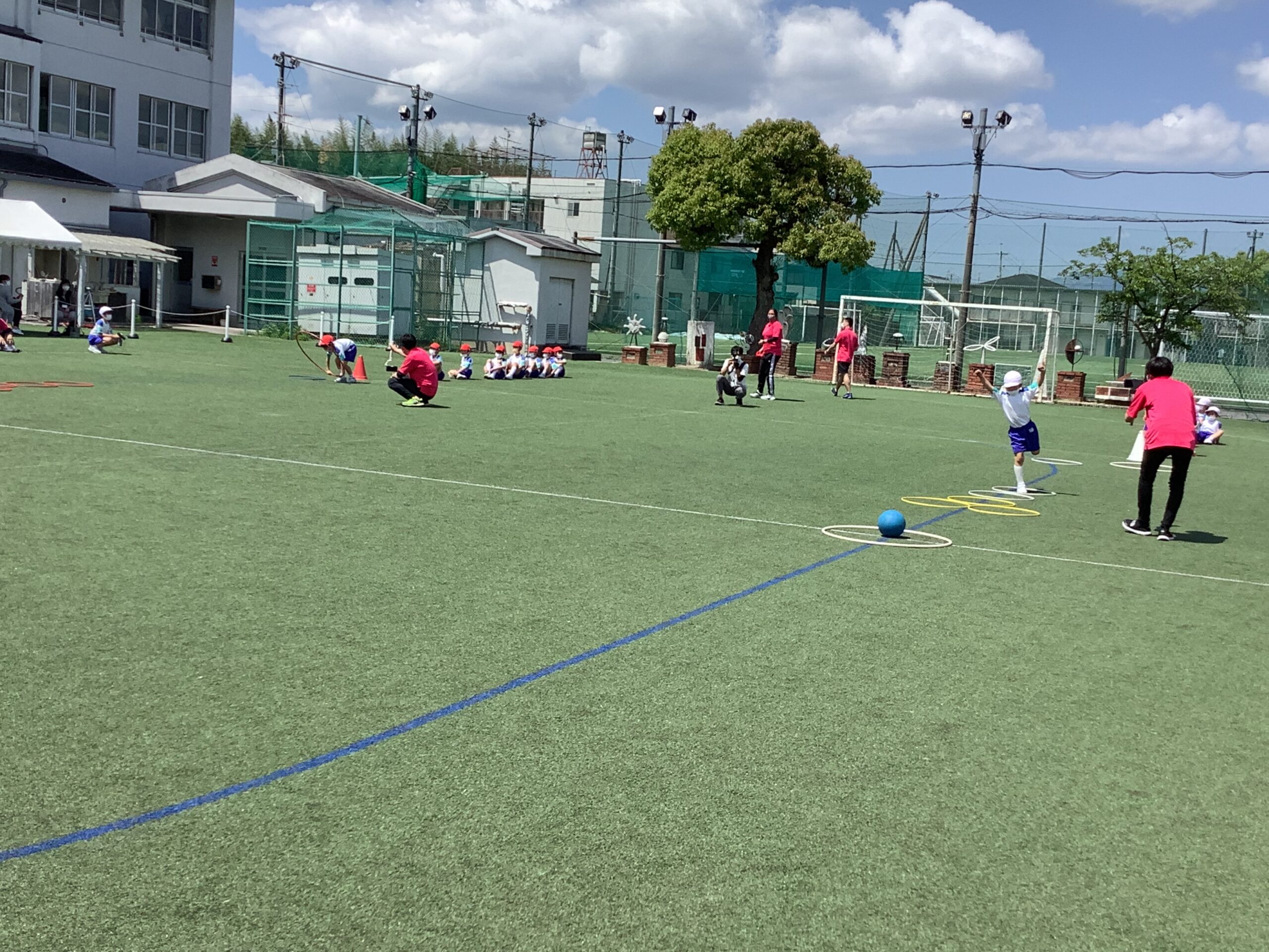 2年生の障害物競走。巧みにフープやボールを扱います。