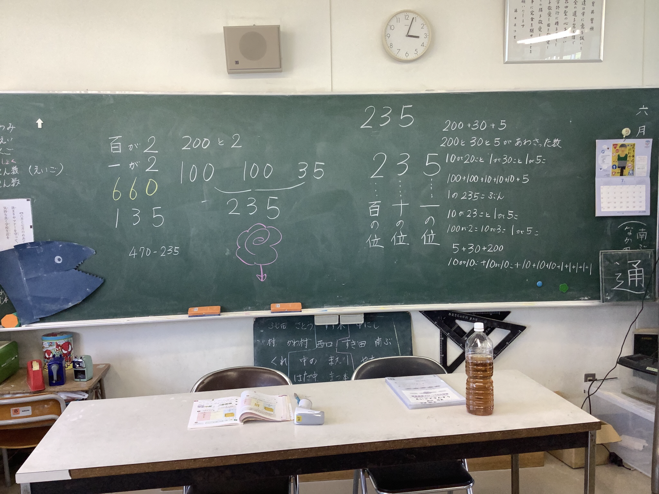 2年生担任の茨木先生から、『2年生の算数の授業で、子ども達がすごくいい発想で数の表現の仕方をしてくれたので、ぜひ玉井副校長先生にもそれを伝えたい』という思いから、授業の様子を教えてくださいました。