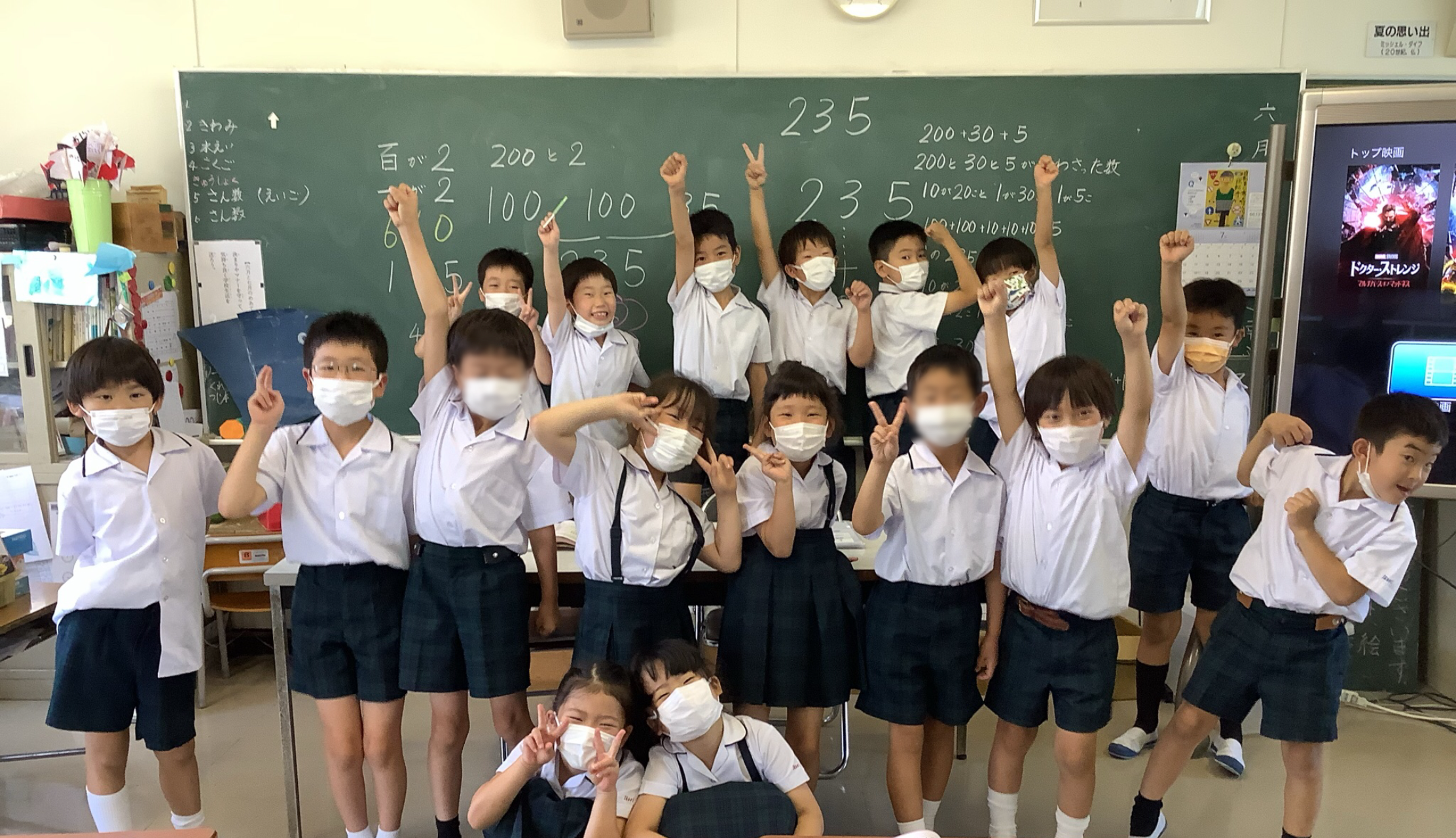 茨木先生が、児童たちに、『玉井副校長先生にもみんなが答えたものを教えてあげるね!』と言って、黒板の写真を撮っていたら、全員「自分たちも玉井先生の写真に映る!」といって記念撮影が始まりました。