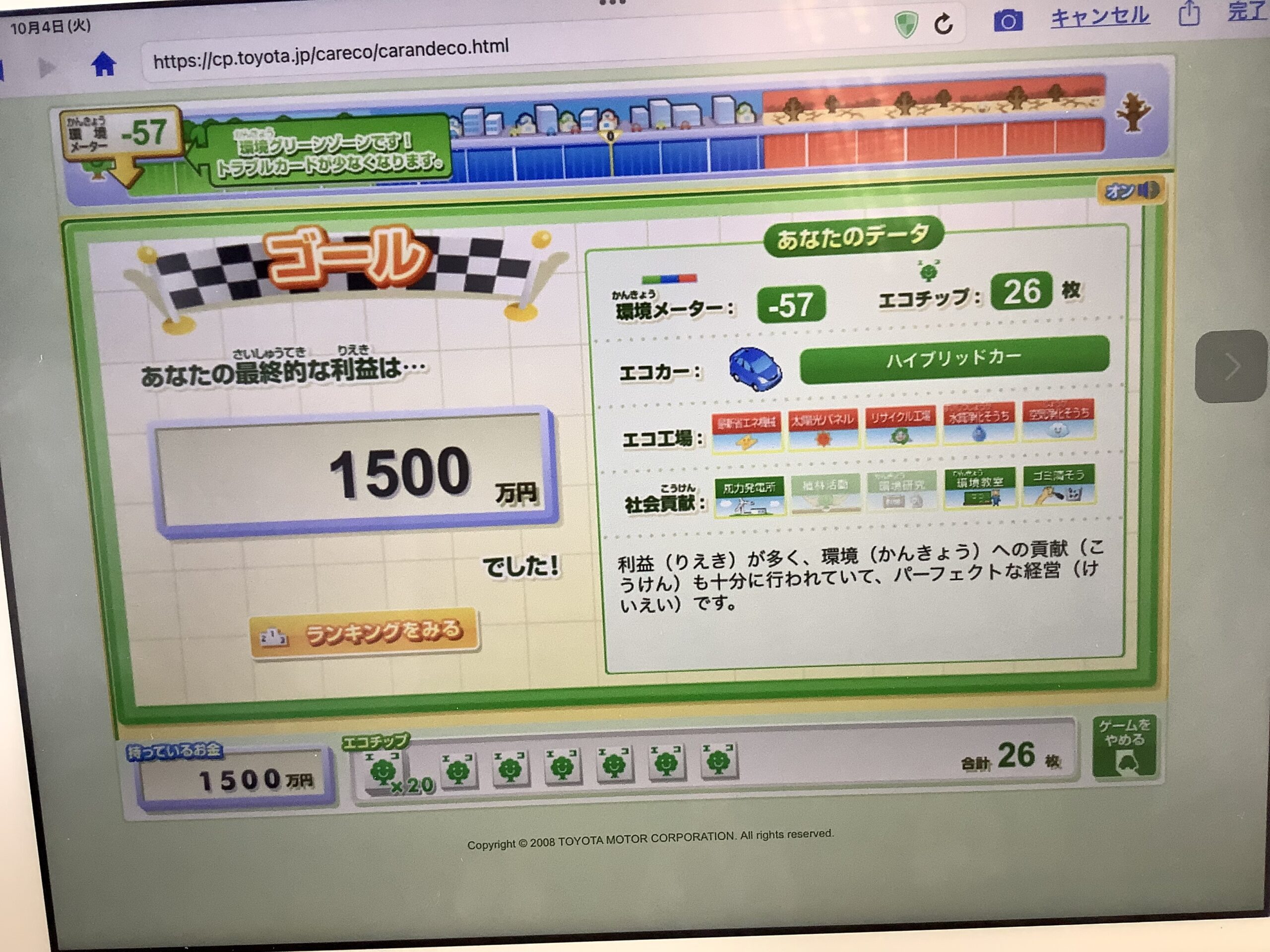続いて、自動車会社の社長になって環境に優しい車を開発するゲームをしました。経済と環境のバランスを考えながら攻略しよう!