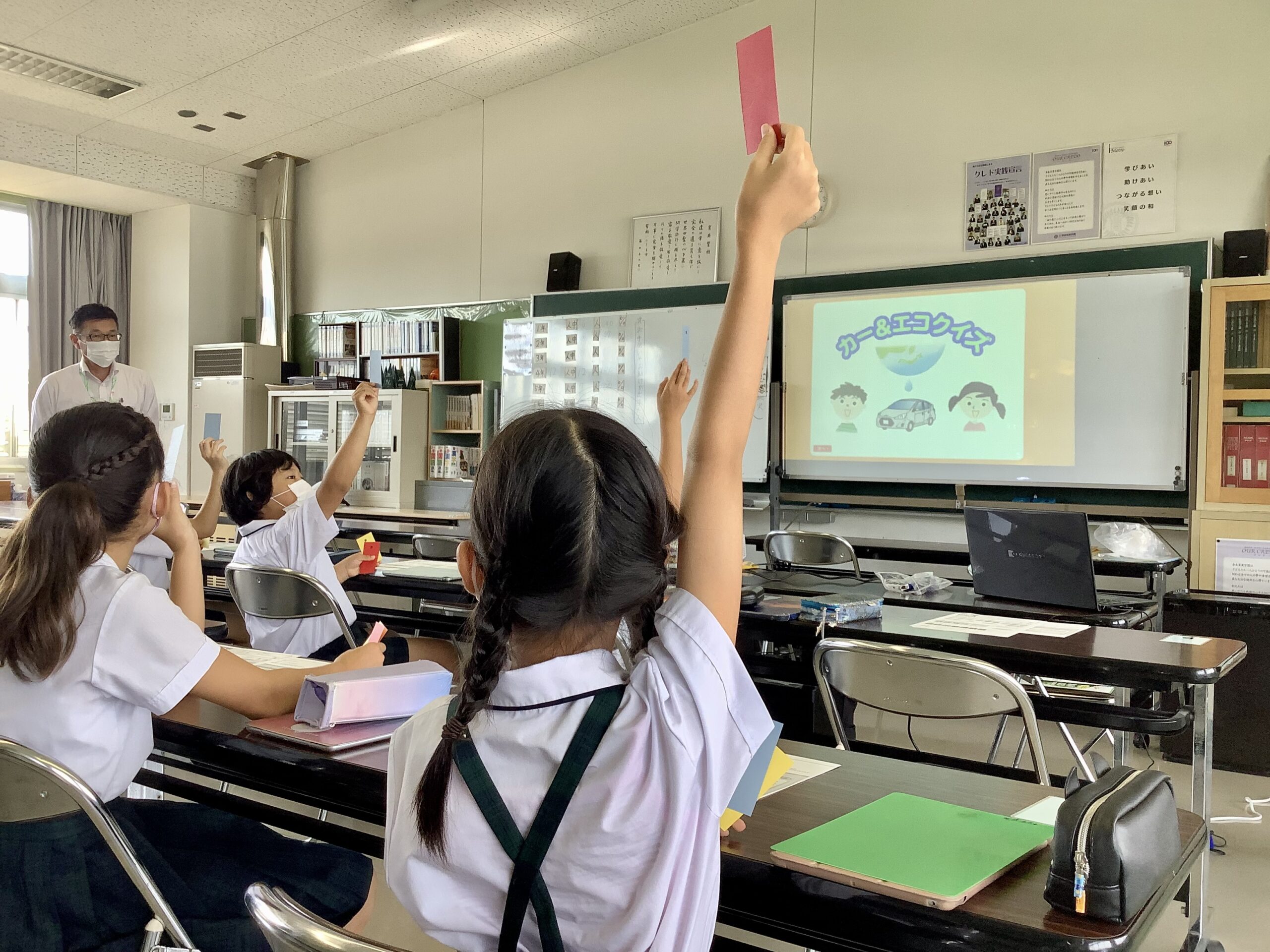 今日は5年生のゲストティーチャーにトヨタ未来スクールの方々をお迎えして、車と環境について学習しました。