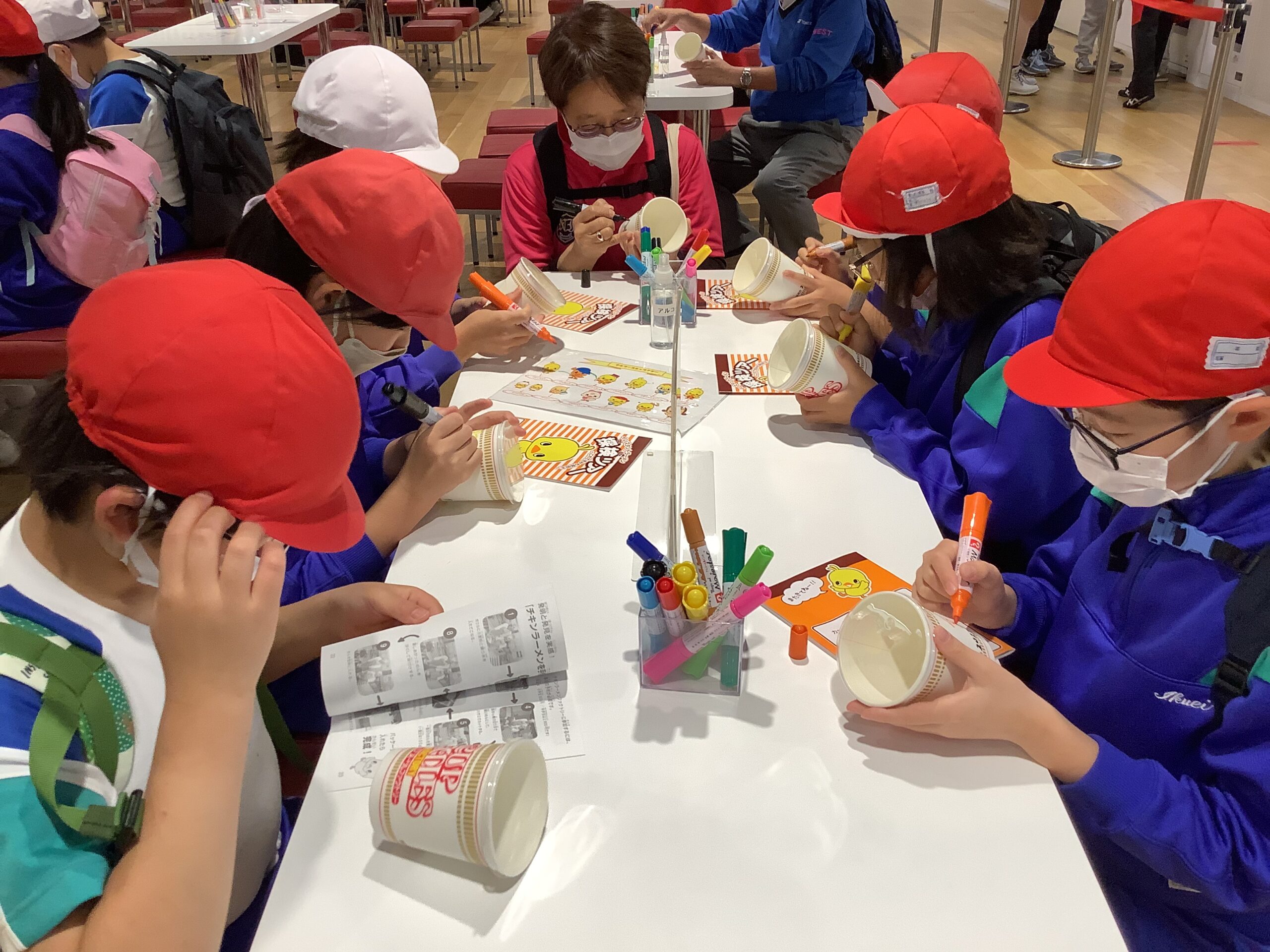 カップヌードルミュージアムでは、みんなが楽しみにいていた、マイカップヌードルを作りました。まずは、パッケージに絵を描きます。