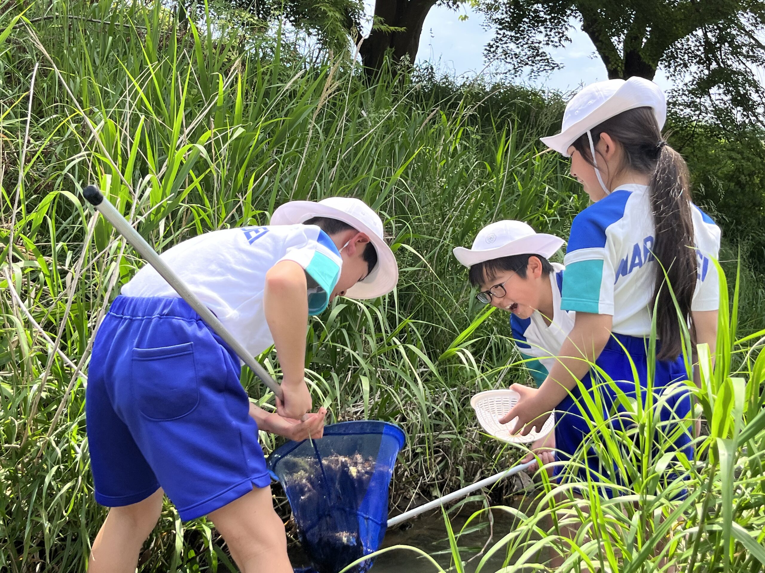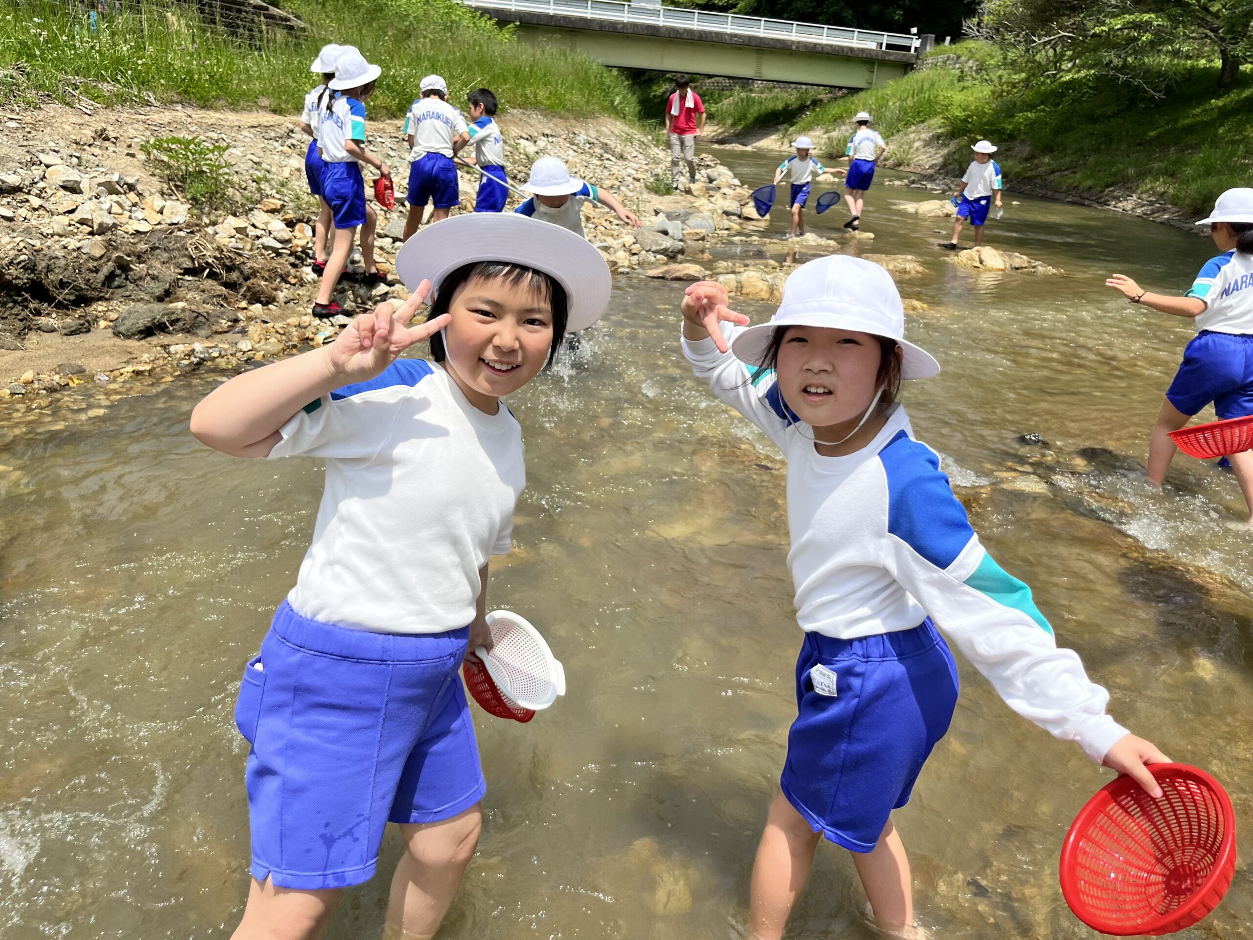 明日の天気が雨の予報だったため、急きょプログラムを変更。4年生は白砂川探検です。網をもって川に入り、「とったどー!」エビ、ヤゴなどたくさん収穫できました。