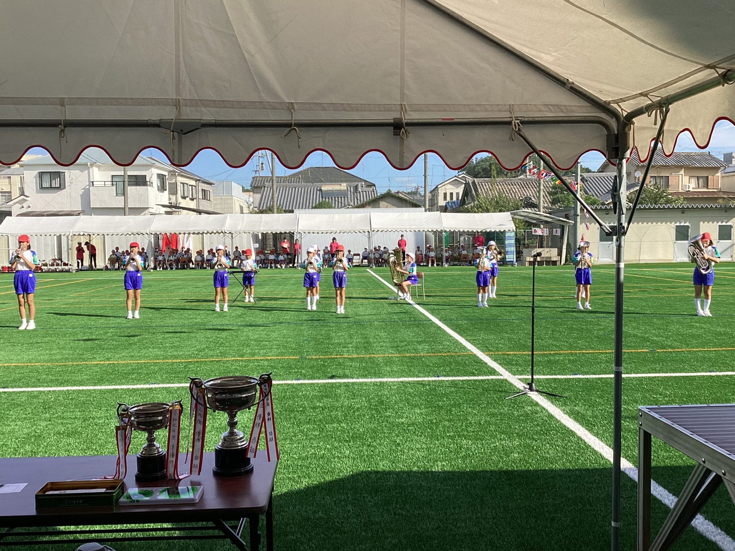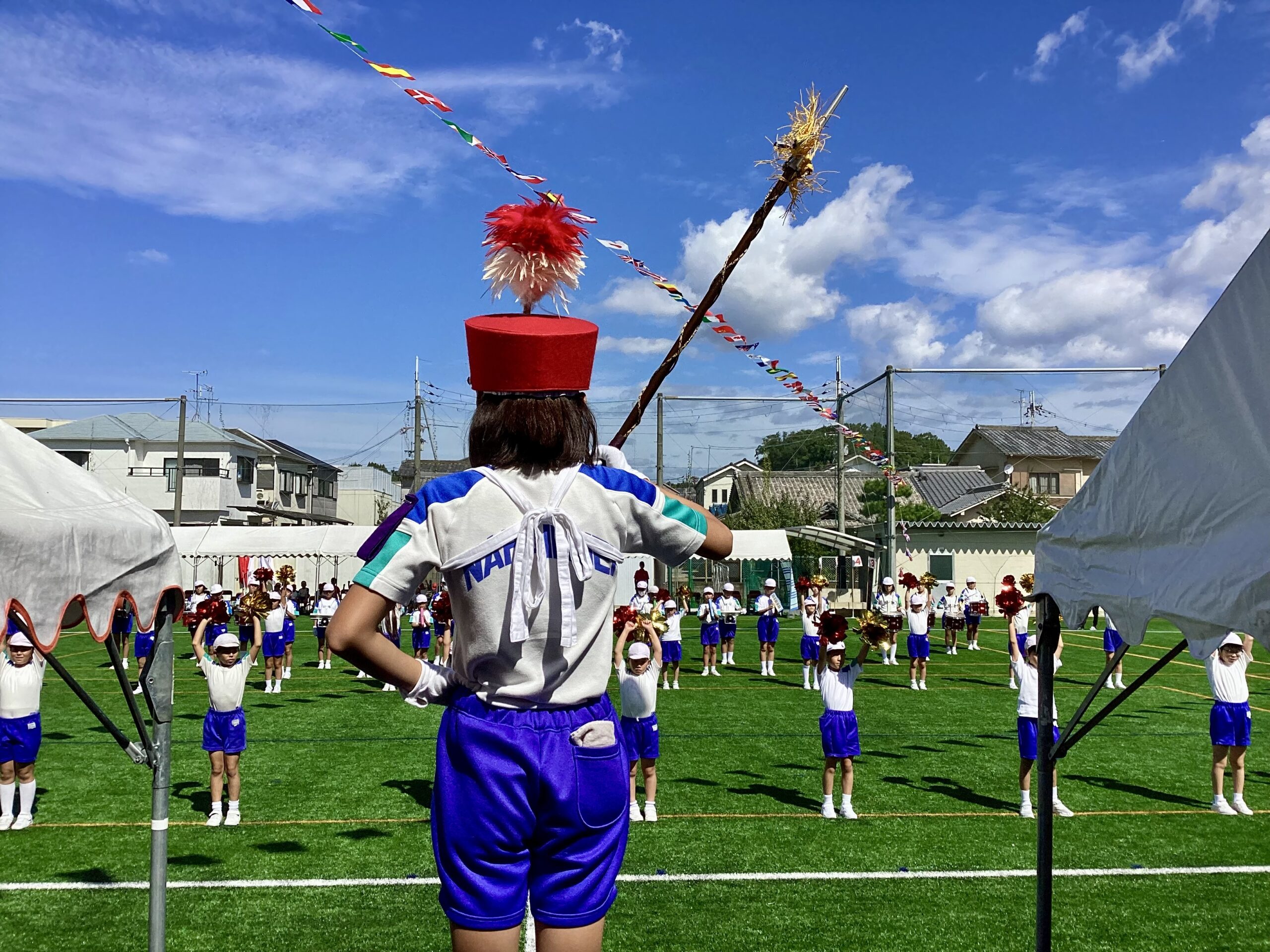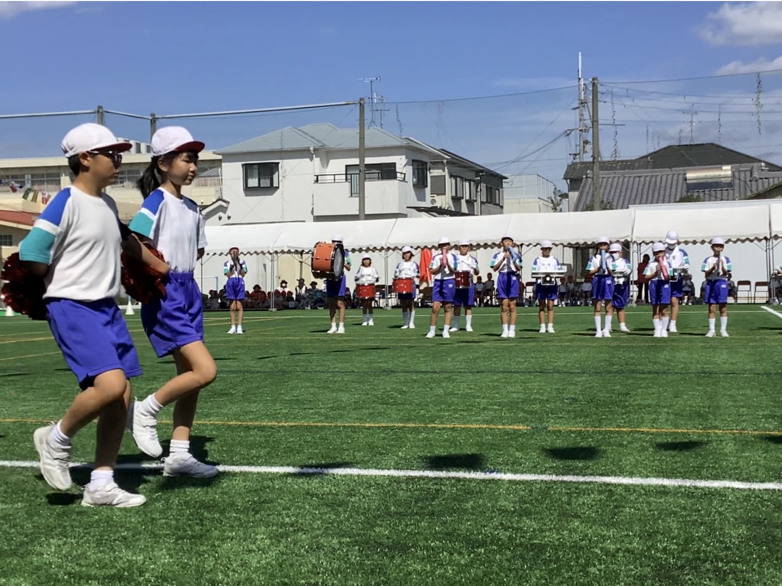 今年は3年生から6年生でマーチングをしました。伝統の「ゆかいに歩けば」から始まり、「三原色」と演奏が続きました。5・6年生の演奏に合わせて3・4年生がダンスをしました。腕もよく伸びていて、キラキラのポンポンがとてもきれいに見えました。